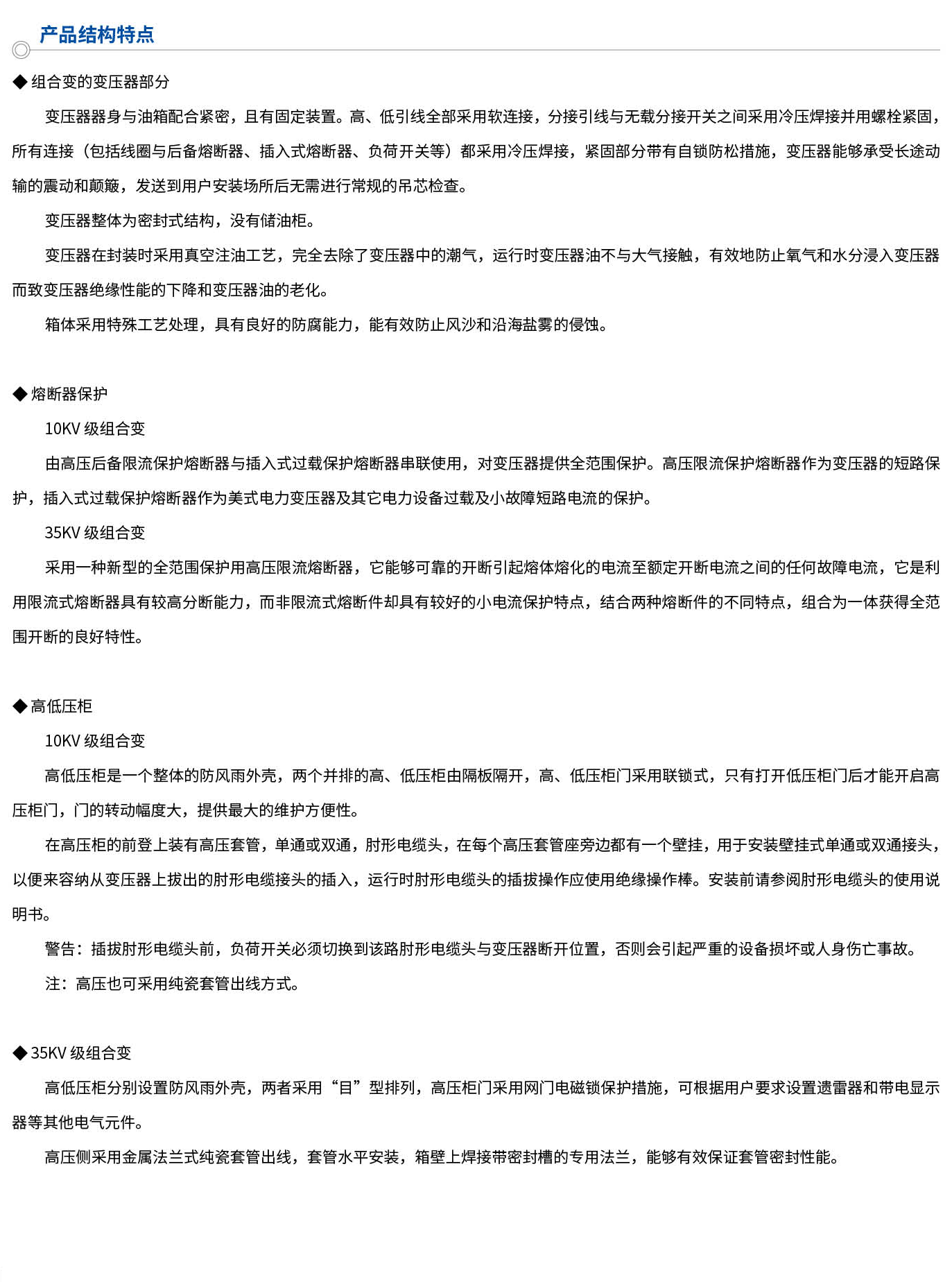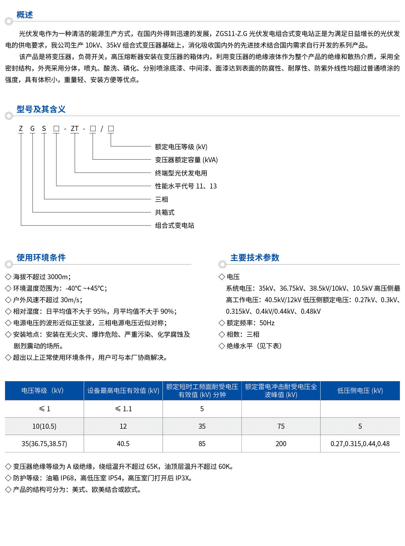 光伏发电作为一种清洁的能源生产方式,在国内外得到迅速的发展,ZGS11-Z.G光伏发电组合式变电站正是为满足日益增长的光伏发电的供电要求,我公司生产10kV、35kV组合式变压器基础上,消化吸收国内外的先进技术结合国内需求自行开发的系列产品。该产品是将变压器,负荷开关,高压熔断器安装在变压器的箱体内,利用变压器的绝缘液体作为整个产品的绝缘和散热介质,采用全密封结构,外壳采用分体,喷丸、酸洗、磷化、分别喷涂底漆、中间漆、面漆达到表面的防腐性、耐厚性、防紫外线性均超过普通喷涂的强度,具有体积小,重量轻、安装方便等优点。