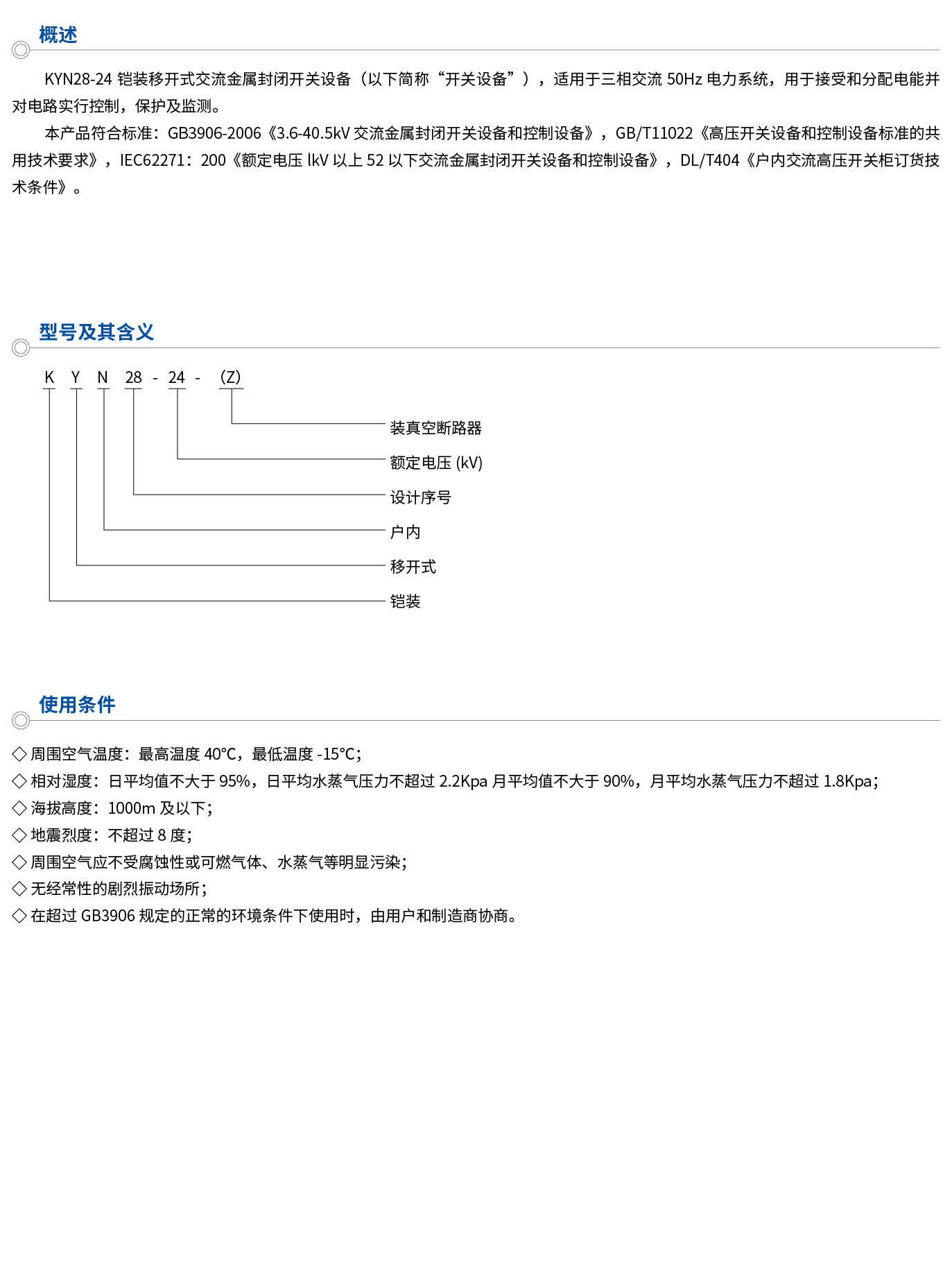 KYN28-24铠装移开式交流金属封闭开关设备(以下简称“开关设备”),适用于三相交流50Hz电力系统,用于接受和分配电能并对电路实行控制,保护及监测。本产品符合标准:GB3906-2006《3.6-40.5kW交流金属封闭开关设备和控制设备》,GB/T11022《高压开关设备和控制设备标准的共用技术要求》,IEC62271:200《额定电压kV以上52以下交流金属封闭开关设备和控制设备》,DL/T404《户内交流高压开关柜订货技术条件》。